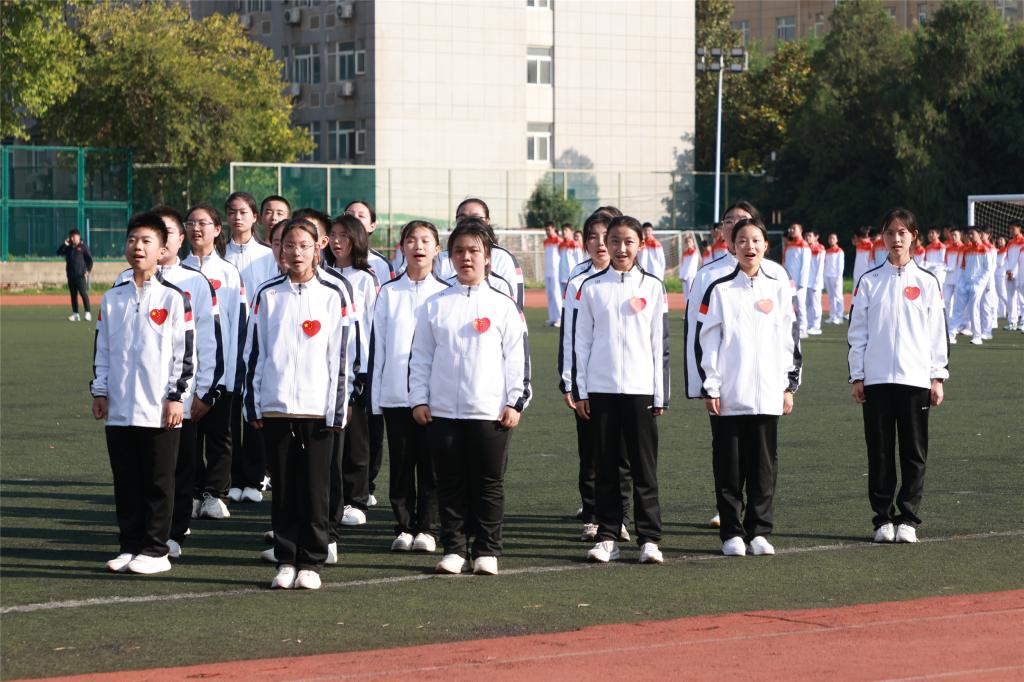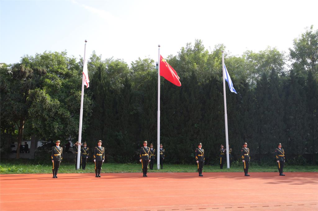 伴随着庄严的国歌声,五星红旗冉冉升起,迎风飘扬。在激昂的旋律中,师生同唱交大附中校歌。