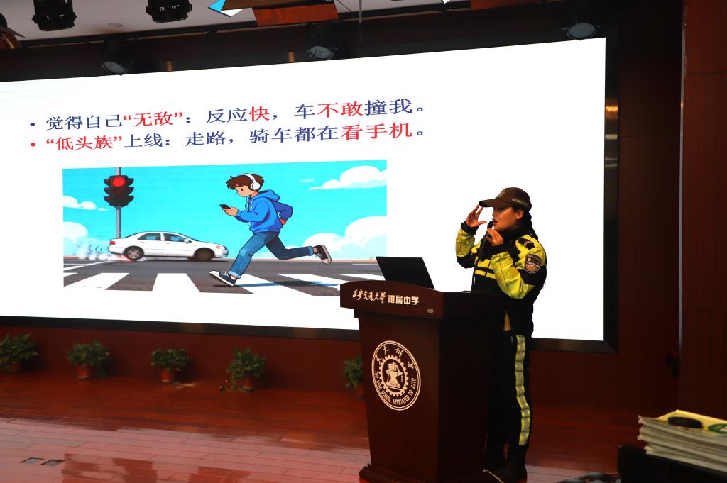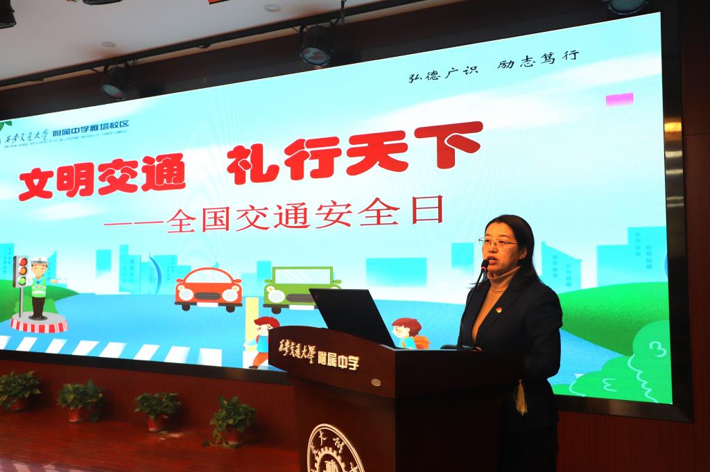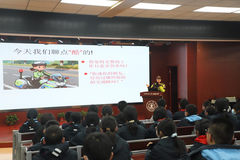 2025年12月2日是第十四个122“全国交通安全日”,为进一步增强全体师生的交通安全意识,提升自我保护能力,营造安全、文明、有序的校园及周边交通环境,围绕“文明交通礼行天下”主题,我校特邀请雁塔交警大队女子铁骑大队张静怡警官走进校园,为2028届初一年级师生带来了一场生动、实用的交通安全知识培训。