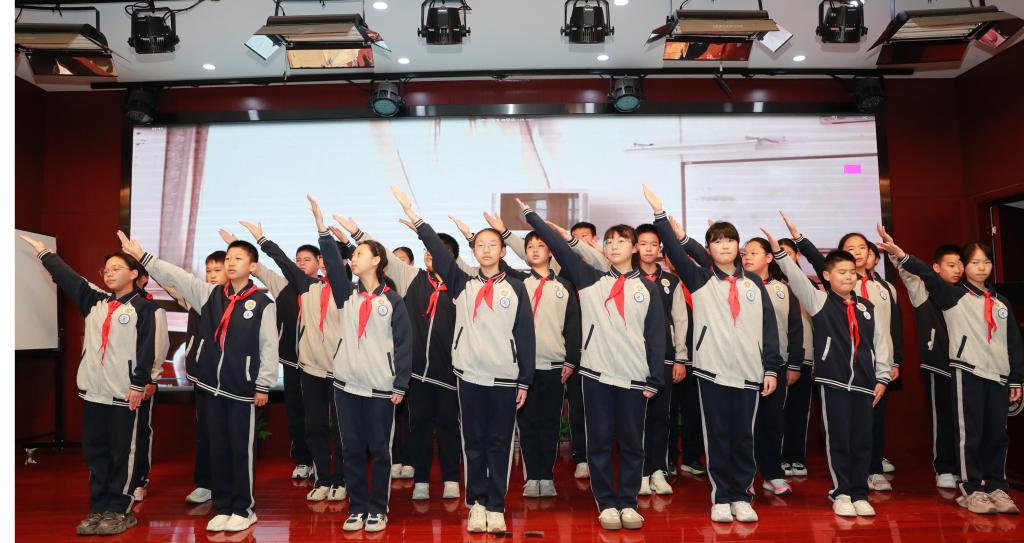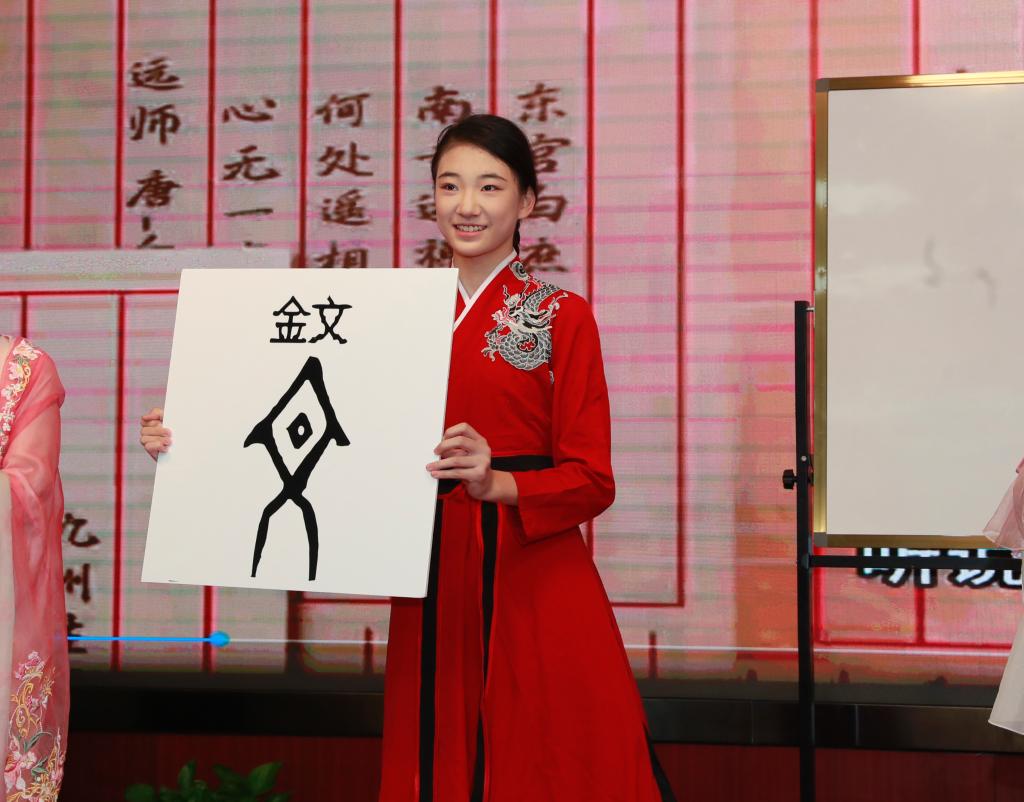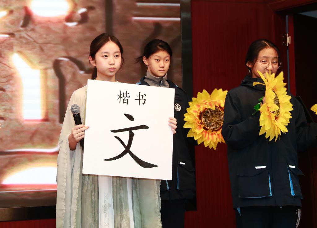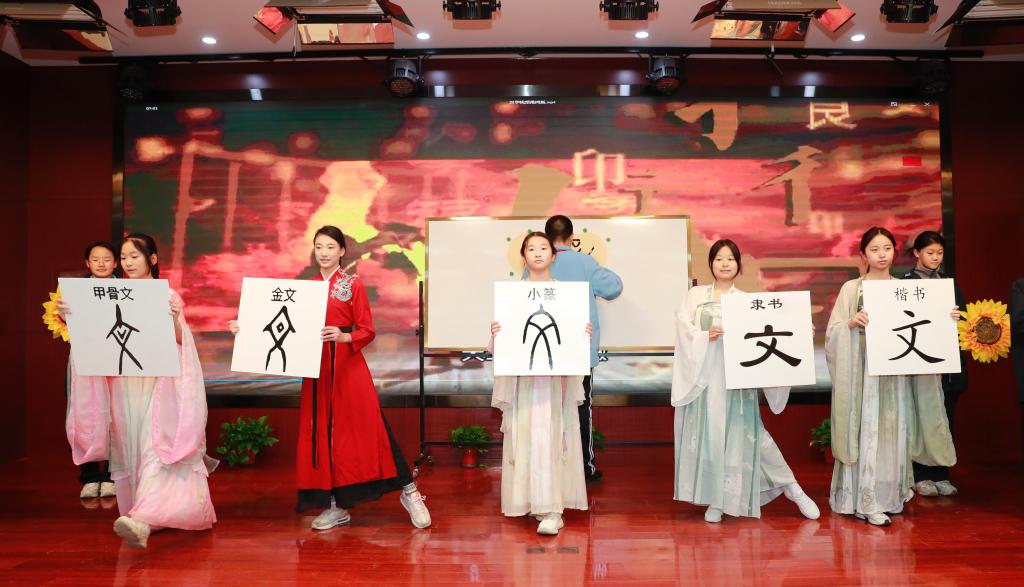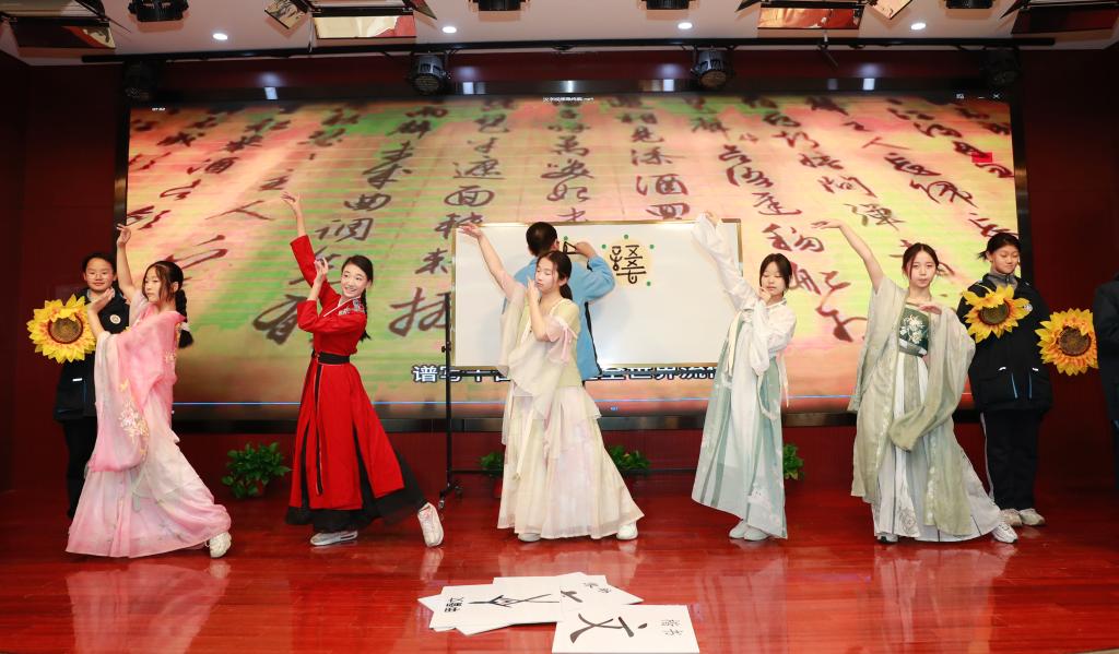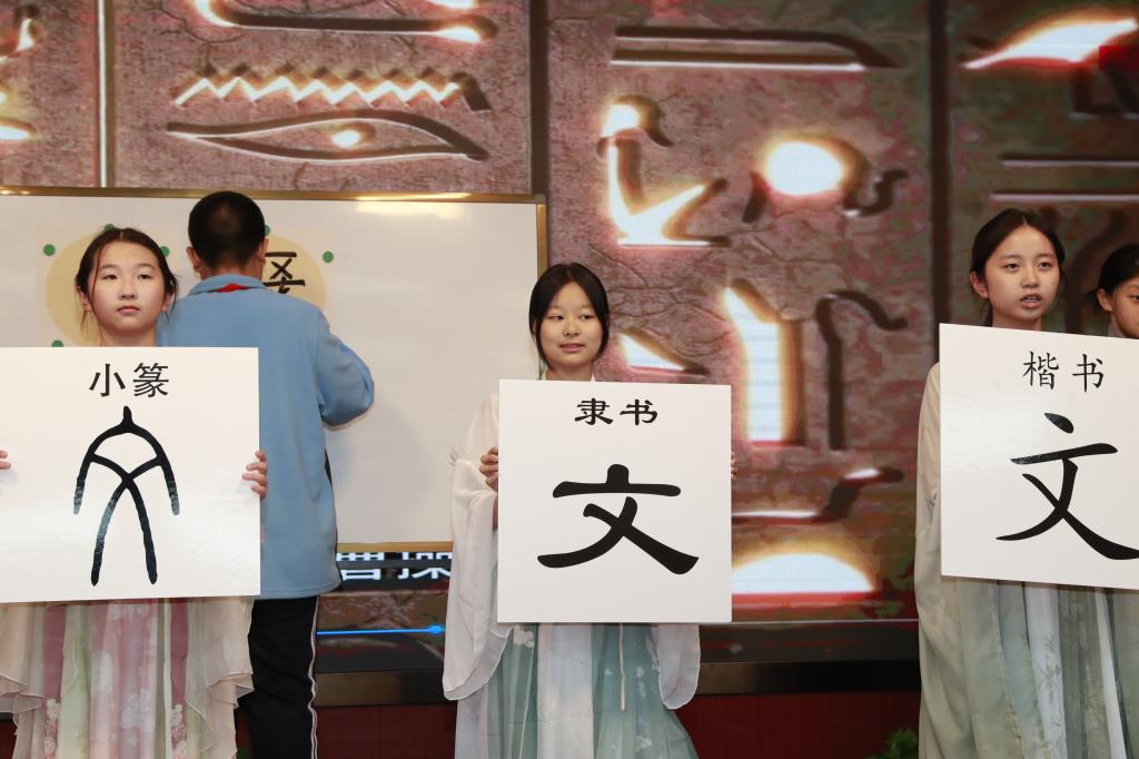 初二年级的《汉字歌》表演,更是一场“活态的汉字课堂”:身着古装的舞者翩跹起舞,舞台背景上,甲骨文的“文”字如刻画在龟甲上的密码,历经金文的厚重、小篆的圆润、隶书的端庄,最终演变为楷书的工整。歌声与舞姿交织,文字与历史碰撞,让在场师生直观触摸到汉字“形与意”的演变之美,也读懂了“一个汉字,就是一部微型的文明史”。