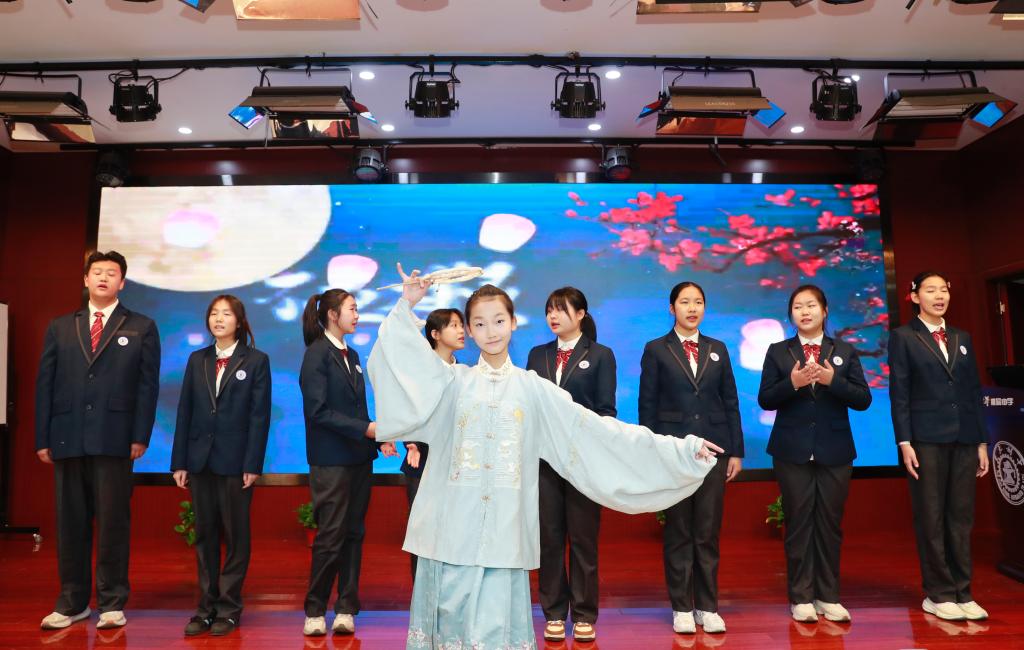 节目展示环节,则将语文的“美”与“力”展现得淋漓尽致,成为一场跨越千年的文化对话。初一年级学子以朗诵串联合唱,演绎梁启超先生的《少年中国说》。“少年强则国强”的铿锵语调,搭配激昂的旋律,不仅让现场听众感受到文字的力量,更看见新时代少年眼中的光芒——那是语文赋予的责任担当,是从经典中汲取的成长底气。