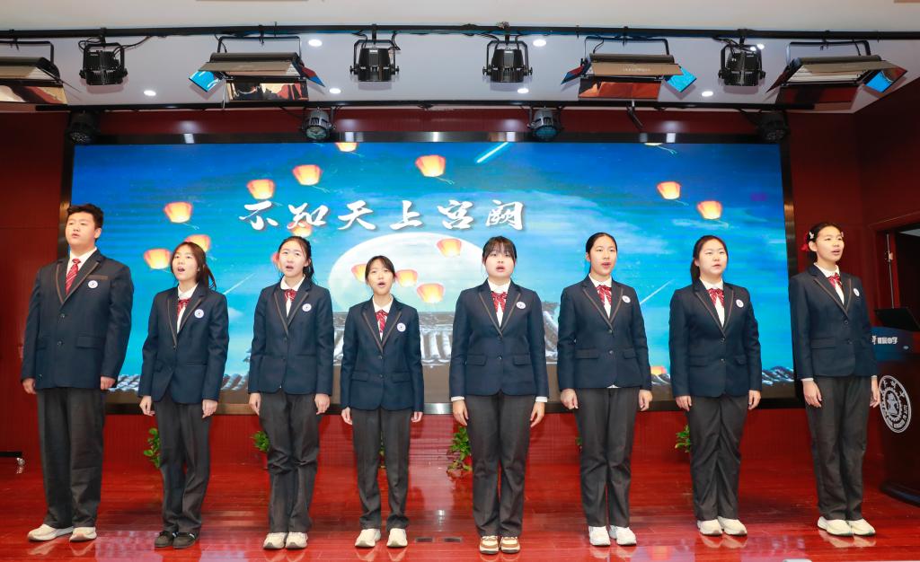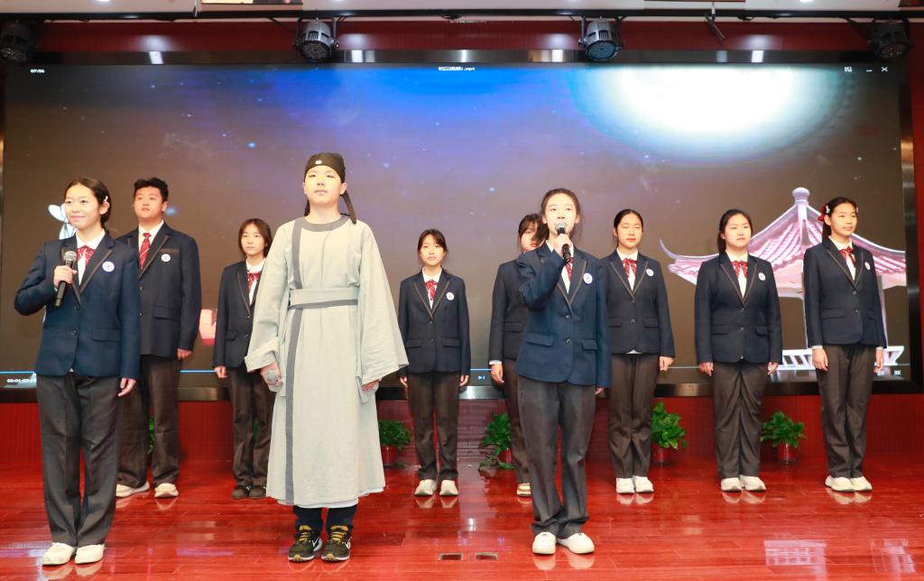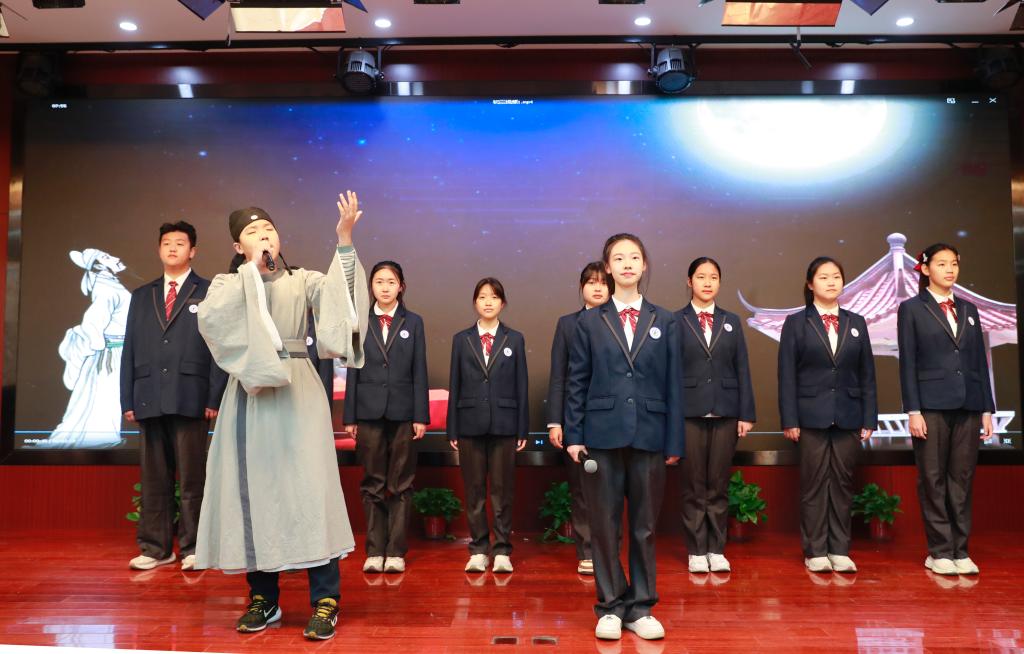 初三年级演绎的《明月几时有》,则以朗诵为骨、歌唱为魂、舞蹈为韵,将苏轼“但愿人长久,千里共婵娟”的豁达与浪漫娓娓道来。悠扬的旋律中,师生们仿佛穿越到宋代的月光下,在诗词的意境里感受情感的共鸣,也体会到语文“以情动人、以美育人”的独特魅力。