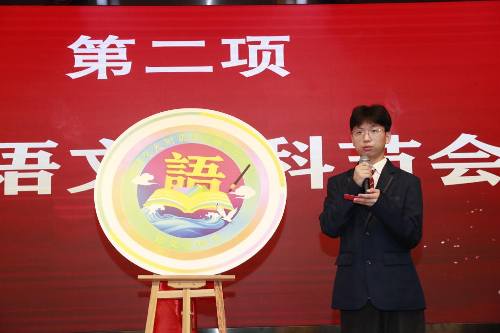 一枚融合了文化意象与青春活力的徽章就此亮相。会徽设计者、初2026届(1)班罗湛华同学的分享,更让这枚徽章有了“灵魂”:“我以‘翻开的书卷’为基底,象征语文的包容与承载;书卷上方是夸张的‘语’字,代表同学们在语文天地里的自由成长;色彩上选用彩色渐变,既呼应文字的悦动,又凸显少年的朝气。”罗湛华的设计理念,恰是“以语文为翼,向文化翱翔”的生动写照,也让现场师生感受到:语文不仅是课堂上的学习内容,更是能融入创意、表达自我的生活方式。