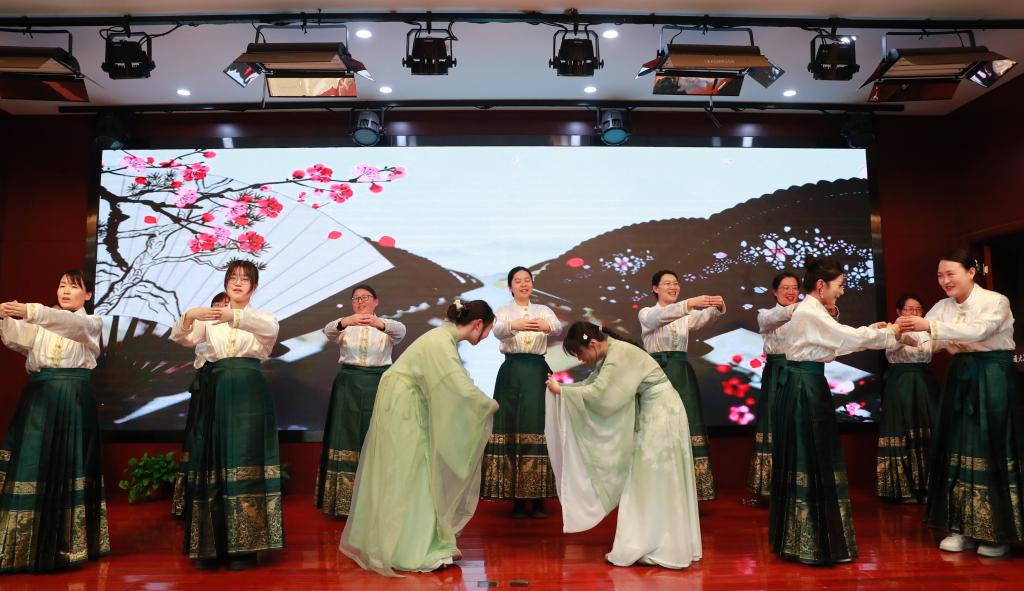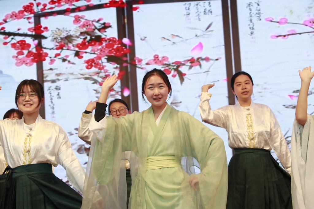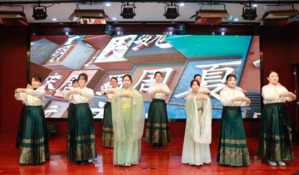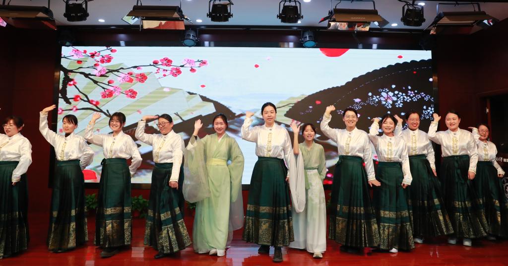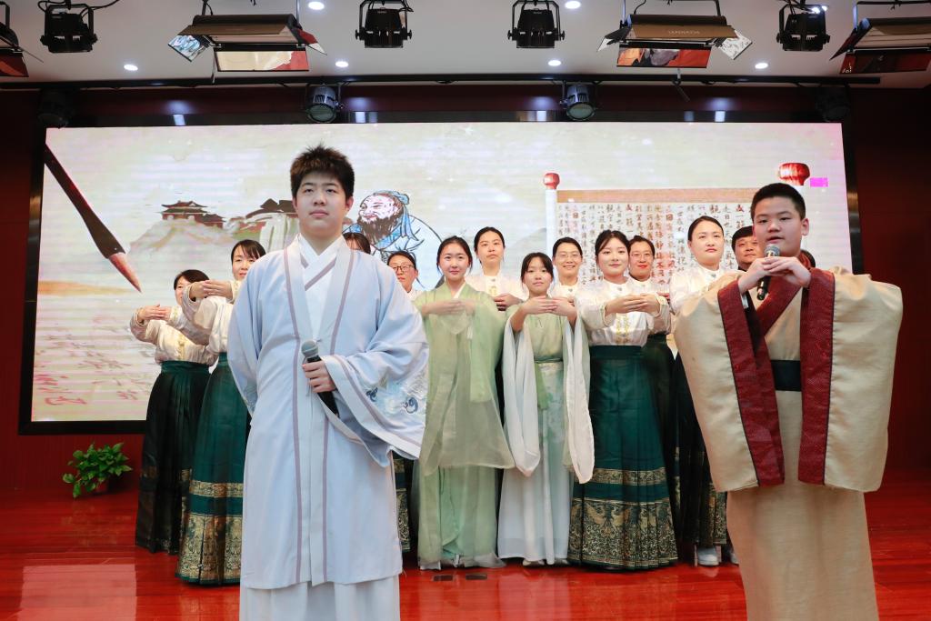 教师节目《诗经》吟唱,将闭幕式推向精神高潮。全体语文教师与学生代表同台,以悠远唱腔唤醒沉睡的千年诗行。“关关雎鸠”的婉转、“蒹葭苍苍”的苍茫,穿越时空的吟唱回荡在报告厅,让《诗经》的质朴与深情,不仅入耳,更入心。从舞蹈的视觉冲击到课本剧的情感共鸣,从颁奖的精神激励到吟唱的文化浸润,这场闭幕式早已超越“活动”的范畴,成为一堂立体的传统文化教育课。