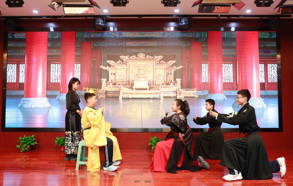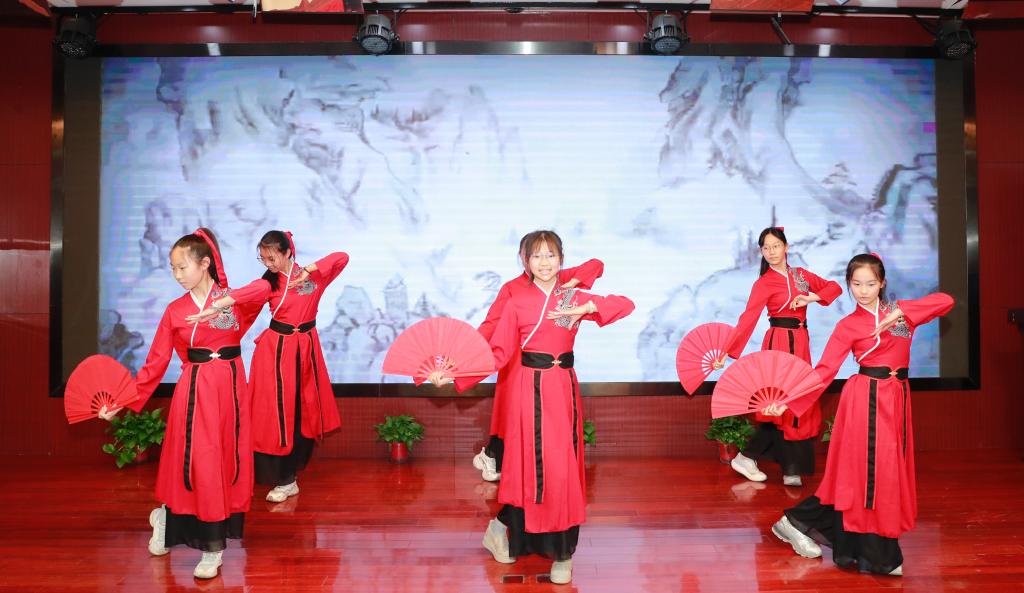 闭幕式现场,古韵新风交织,精彩纷呈的节目轮番上演:热场的古典扇子舞《象王行》以灵动的舞姿瞬间点燃全场氛围;初二年级同学带来的《木兰诗》课本剧,将巾帼英雄的飒爽豪情演绎得淋漓尽致,古朴的台词与贴合的配乐,让经典文本鲜活起来。