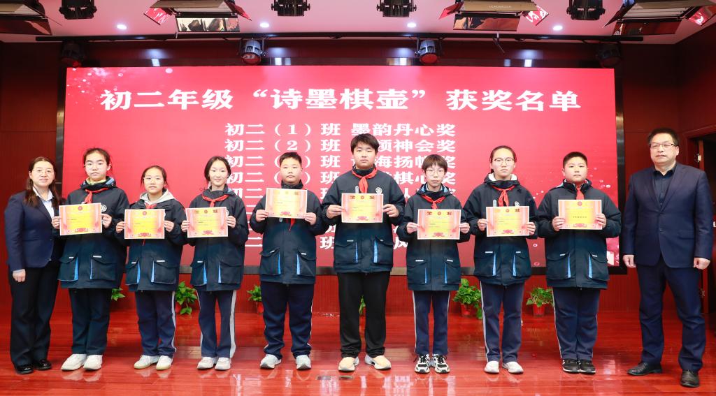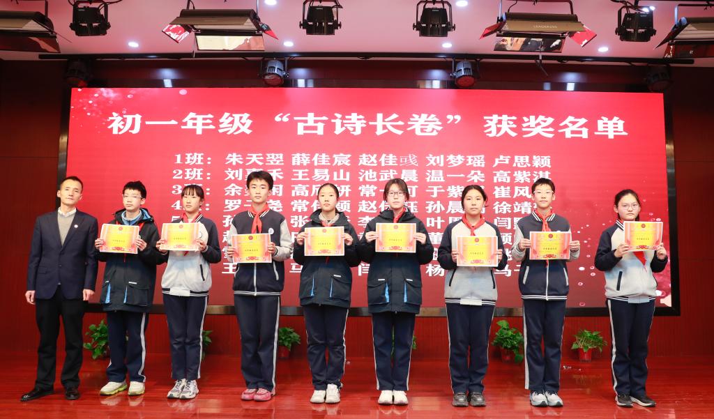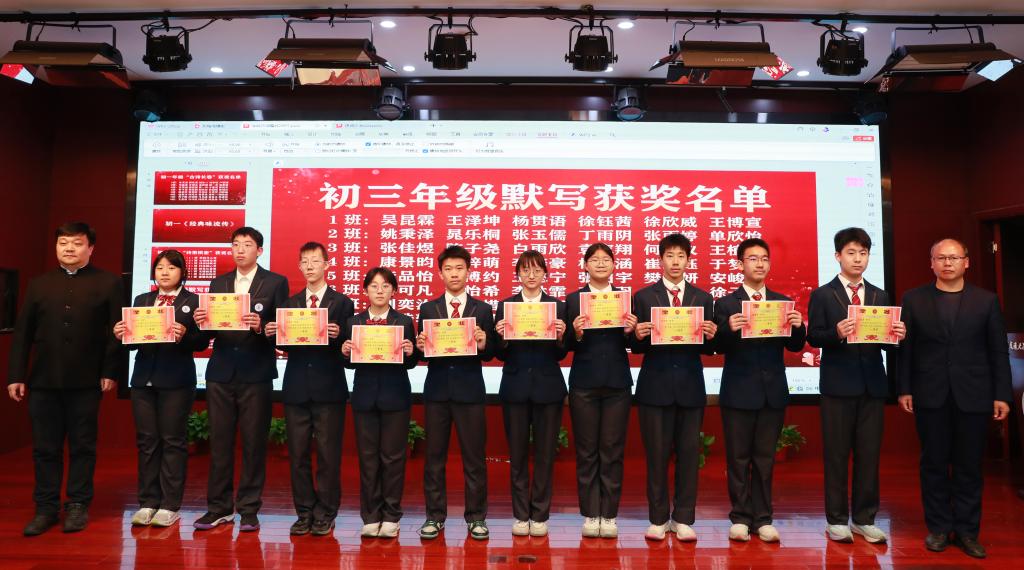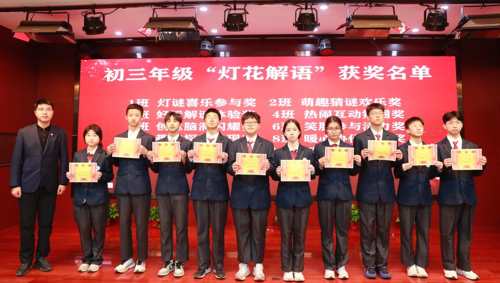 颁奖环节,不仅是对学子才情的礼赞,更是对语文教育本质的诠释。初一年级学子以笔为桨,在汉字的星河中扬帆,展现的是语文学习最本真的热爱;初二年级的颁奖现场,“飞花令”里见诗词积累,“猜成语”中显文化积淀,“诗歌接龙”间藏思维灵动,老师们以趣味形式搭建起文化桥梁,让汉语的韵律与智慧在竞技中自然流淌;初三年级学子则在笔尖与灯谜间探寻雅趣,墨痕里晕染诗典风华,谜题中暗藏汉字玄机,尽显语文学习的深度与广度。