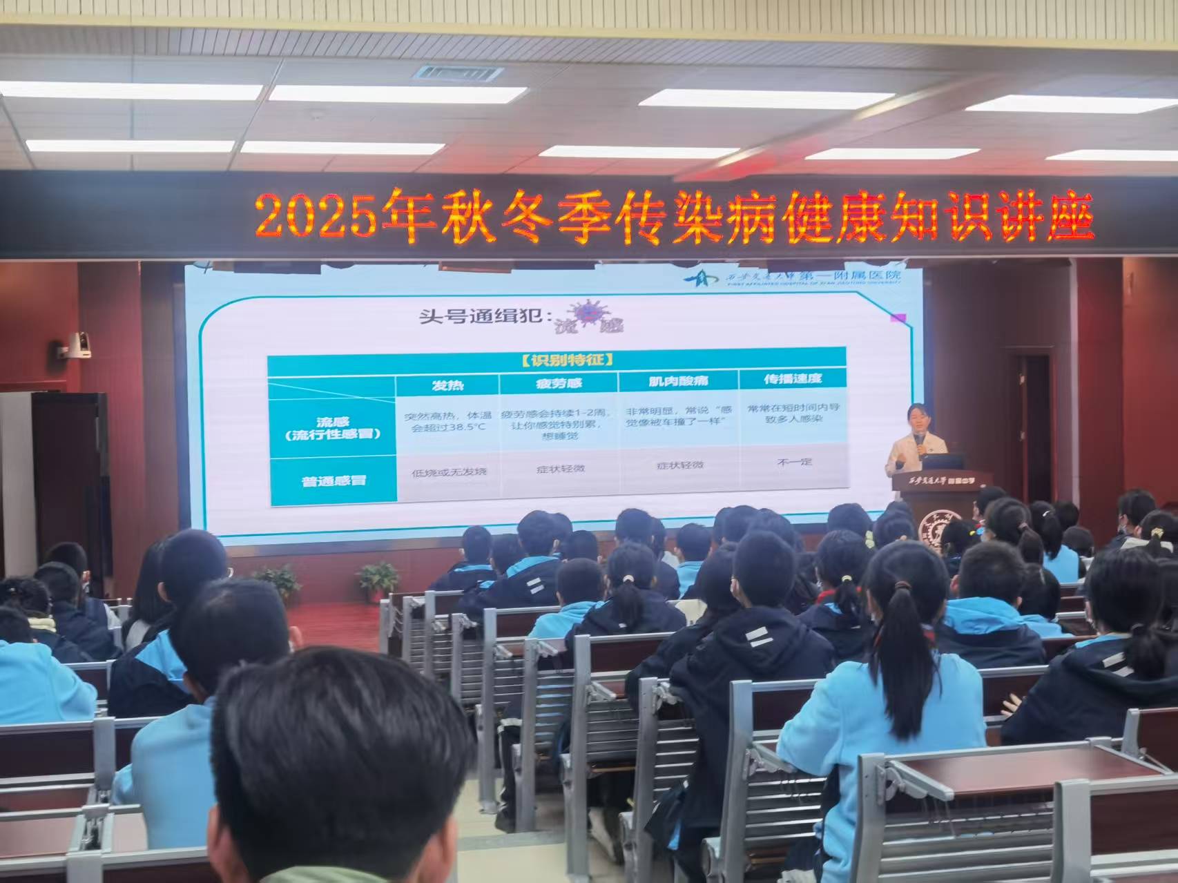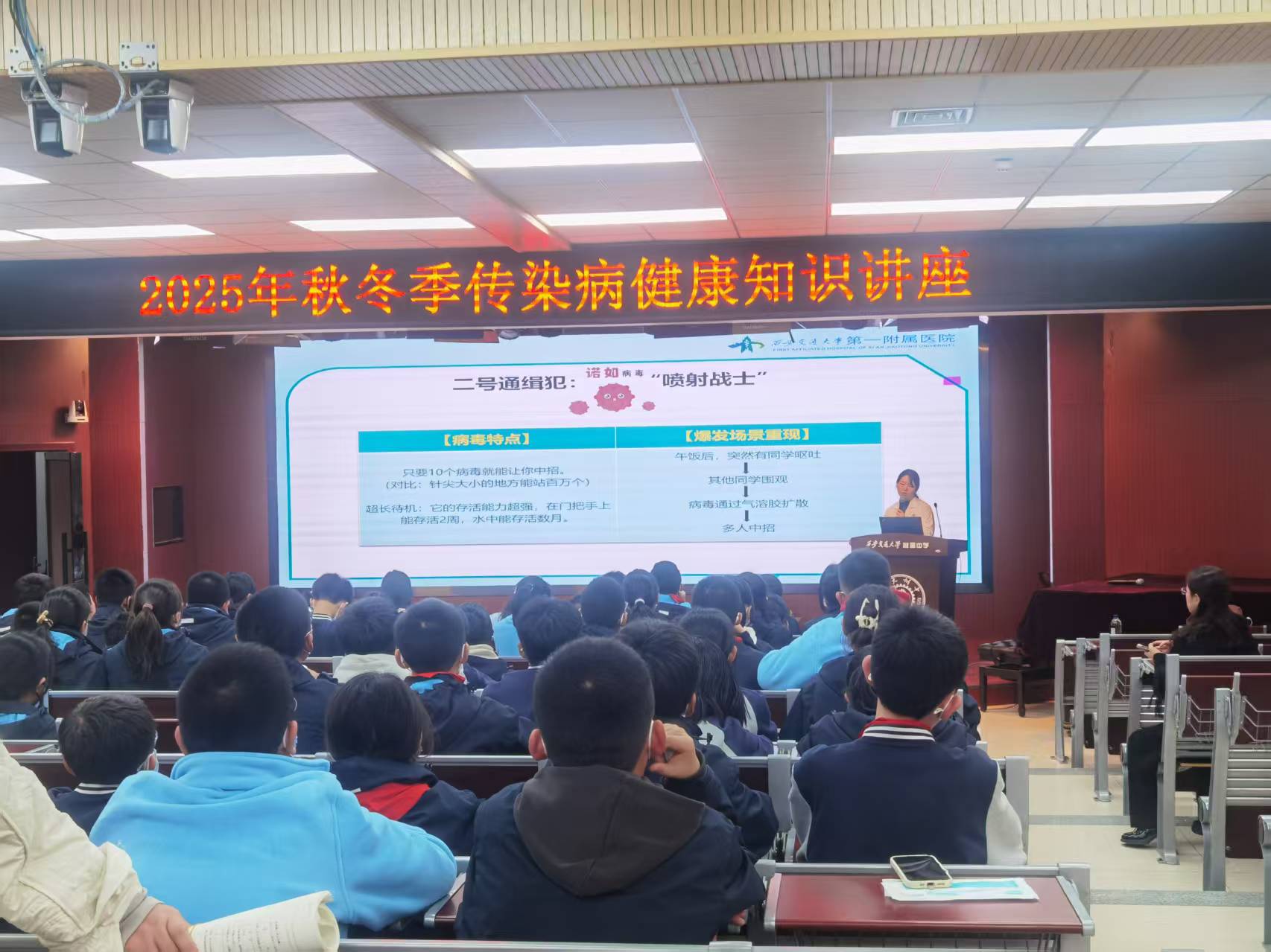 讲座现场,秦护士长结合校园聚集性学习生活的特点,以生动通俗的语言、贴近学生日常的案例,聚焦流感、诺如病毒感染、水痘三大高发传染病,从传播途径、典型症状、危害影响三个维度展开细致讲解。她特别针对青少年免疫力特点,拆解了校园内病毒传播的关键场景,让同学们直观认识到传染病防控的重要性。