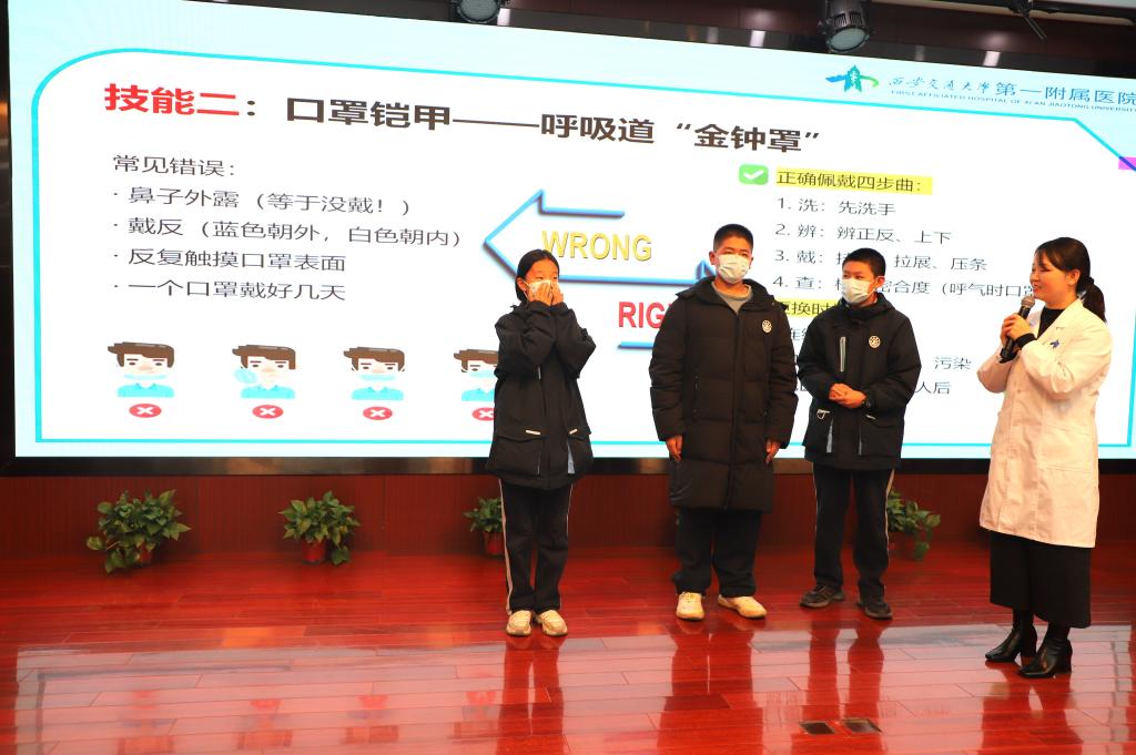 互动环节气氛热烈,同学们积极举手抢答问题,主动学习健康知识。讲座互动环节氛围热烈。秦丽君护士长通过“举手抢答”“情景提问”等形式与学生积极互动。当问到“当班级出现学生呕吐该如何处理”“如何正确佩戴口罩”等问题时,同学们纷纷举手,三位同学自告奋勇,上台进行正确佩戴口罩演示轰动。秦护士长逐一点评并补充关键知识点,帮助大家纠正认知误区,加深知识记忆。