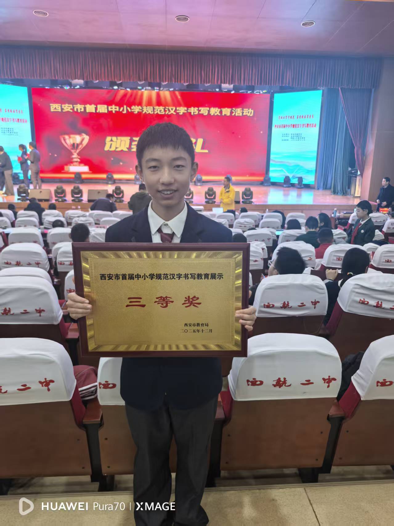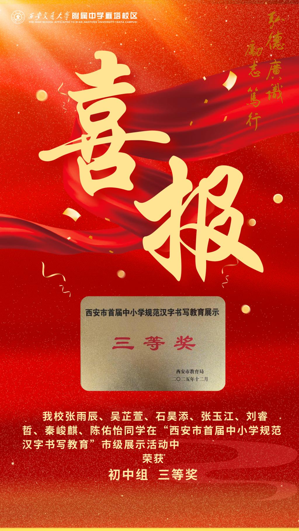 汉字书写的一笔一画中,蕴含着中国文字的千年文脉与精神风骨。西安交通大学附属中学高度重视此次展示活动,教研室副主任屈晶、语文组张玺、郝梦帆老师组成指导团队,带领初二年级张雨辰、吴芷萱、石昊添、张玉江、刘睿哲、秦峻麒、陈佑怡等七名同学全力备战。同学们利用课余时间扎实积累汉字知识,反复练习书写技法,在指导老师的悉心点拨下打磨细节、精进能力。赛场之上,选手们沉着冷静、沉稳应答,以扎实的功底、规范的书写和敏锐的思维从容应对各环节挑战,最终脱颖而出,荣获市级三等奖。