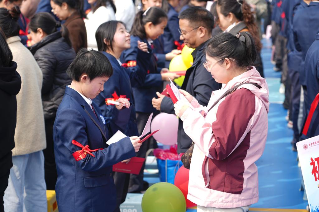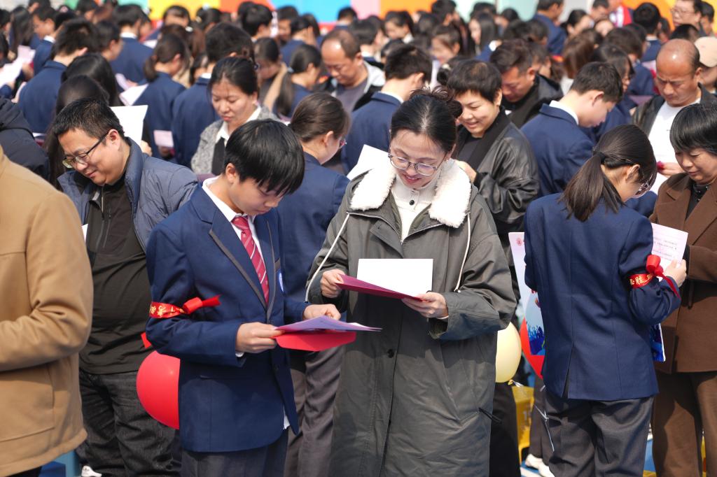 互动环节,家长为学生系上状元带,传递殷切的祝福与期望。学生和家长互换书信,交流心声。一封书信,纸短情长,那是父母对学子的祝福与期望,那是学生对父母的感恩与承诺。
