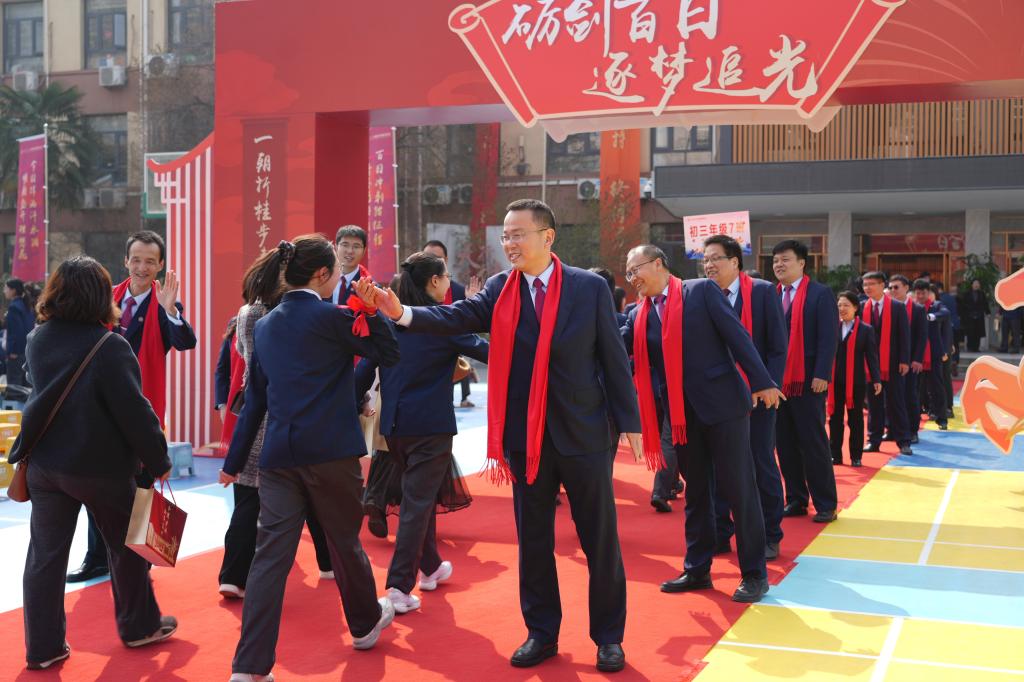 同学和家长们携手走过逐梦追光门。同学们意气风发,信心满怀;学校领导与初三教师团队,列队门前,为学生加油助力。十年磨一剑,霜刃未曾试。事了拂衣去,深藏身与名。