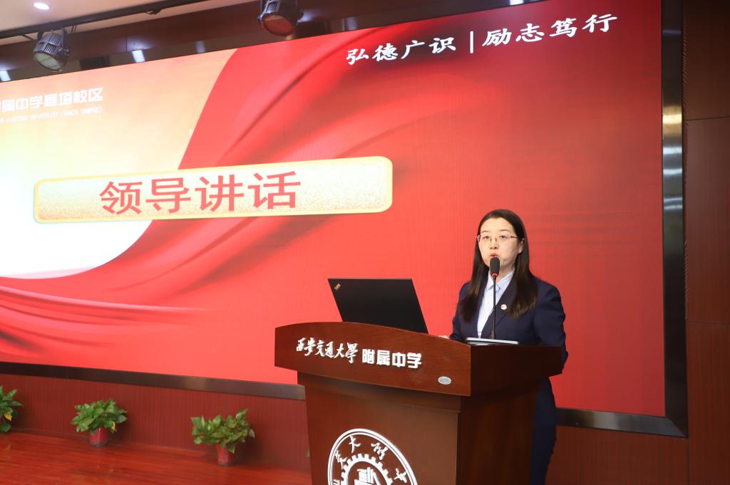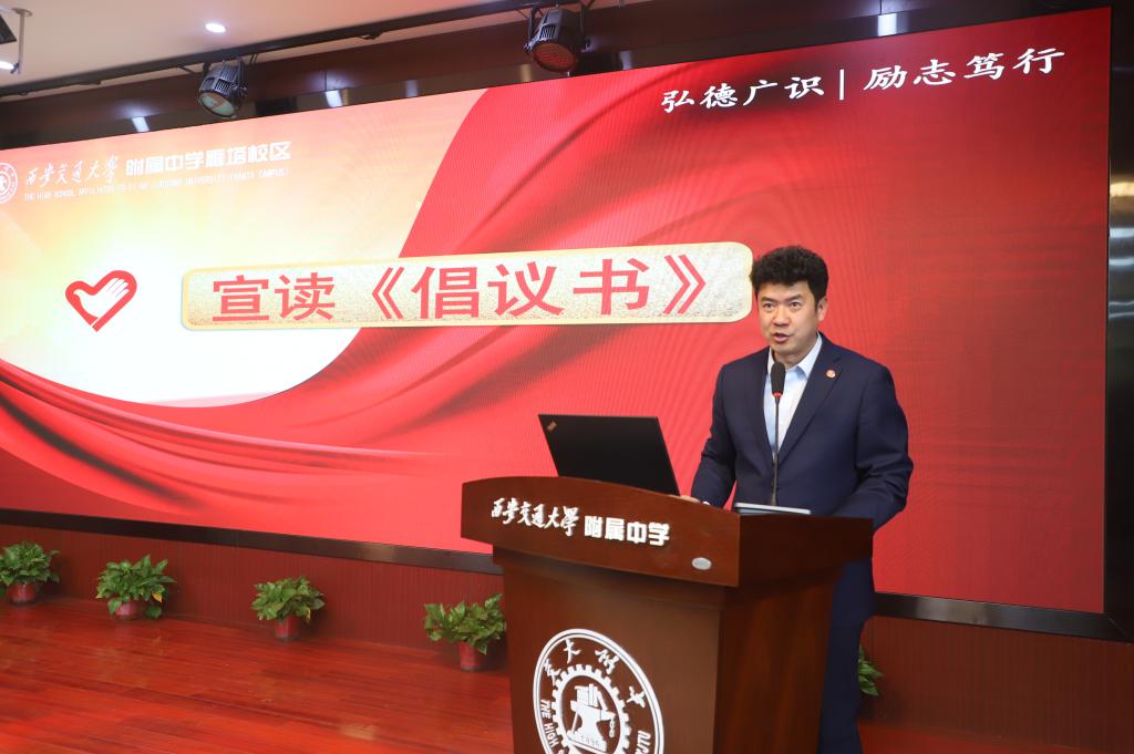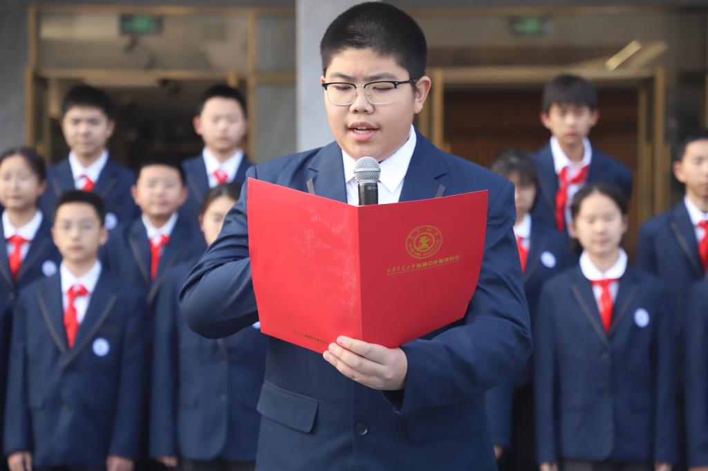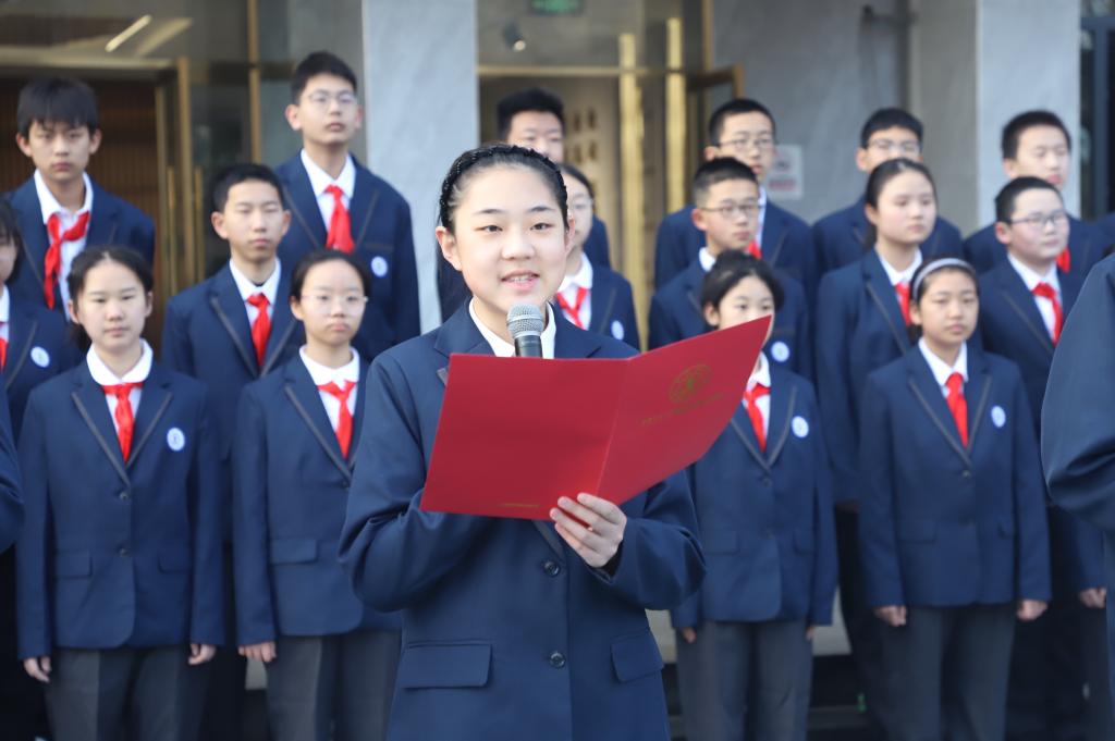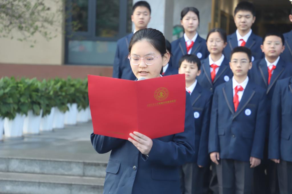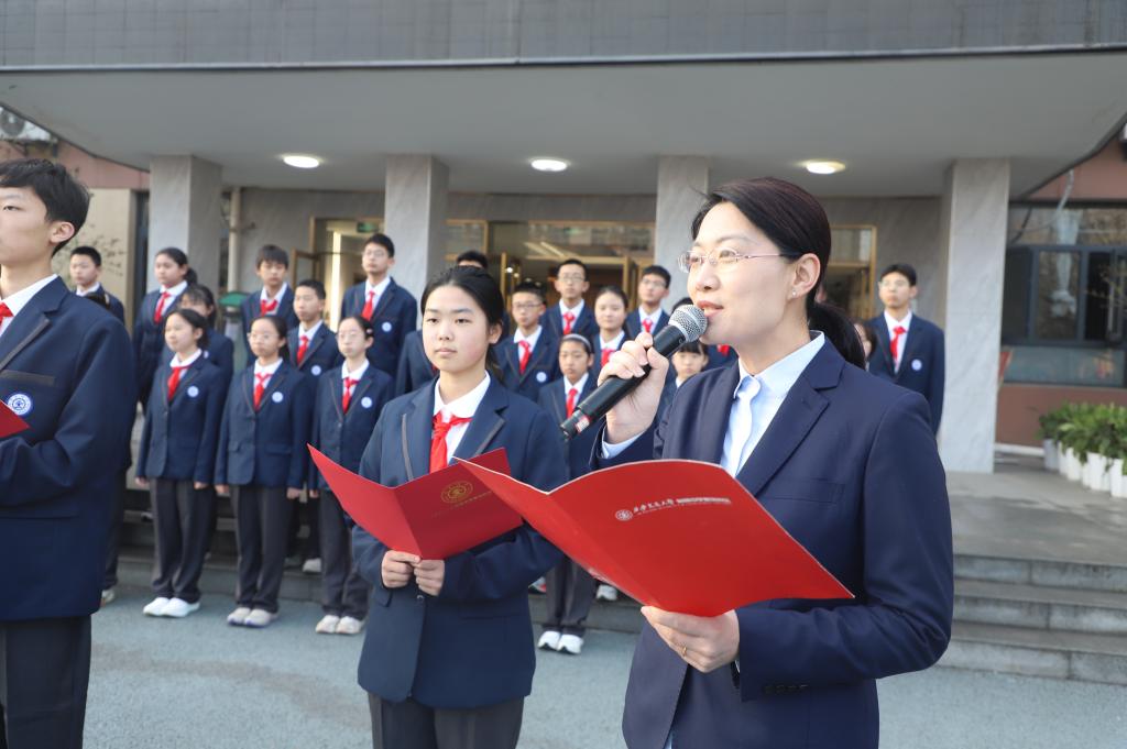 交大附中雁塔校区校长助理周耘冰为学校志愿者服务队授旗,校团委组织委员晁宇可同学作为学生代表郑重接旗。鲜红的队旗既是荣誉也是责任,引领志愿服务队伍开启新的服务征程。