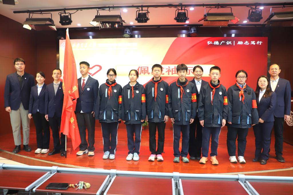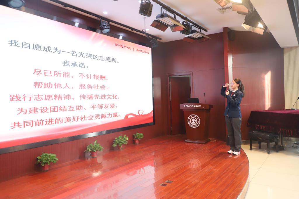 党支部委员、教师代表为志愿服务队代表佩戴袖标,志愿服务袖标成为同学们践行志愿精神的鲜明标识。在校团委宣传委员徐钰茜同学带领下,全体志愿者庄严宣誓,许下传承雷锋精神、践行志愿服务的坚定承诺。