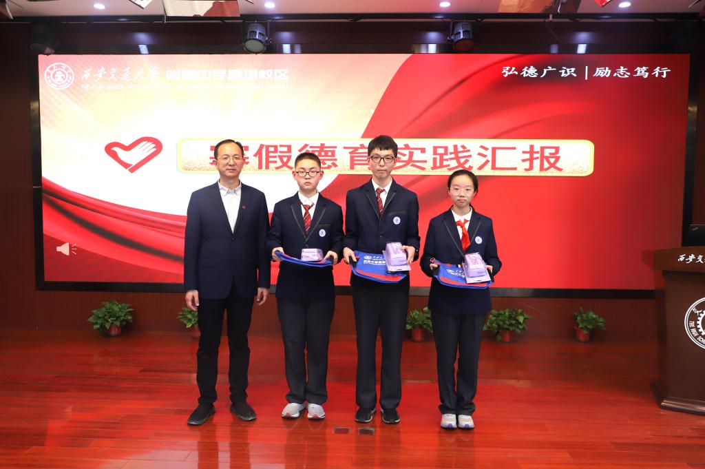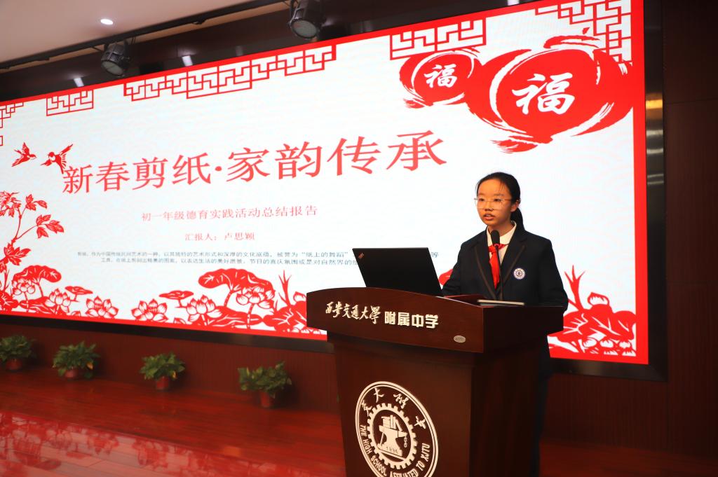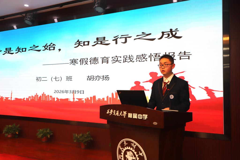 志愿服务月启动仪式上,各年级学生代表依次进行寒假德育实践活动主题汇报。七年级卢思颖、八年级胡亦扬、九年级张静林分别分享非遗剪纸、多元寒假实践、长征精神红色研学的成果与感悟,展现了校区寒假德育实践的丰硕成果。汇报结束后,德育处主任助理马林老师为寒假德育实践活动优秀参与者颁奖,表彰先进、树立榜样。德育处主任杨晓平总结讲话,充分肯定同学们的寒假德育实践,她指出,同学们的行动实践生动诠释了交大附中“弘德、广识、励志、笃行” 的校训精神,勉励同学们做雷锋精神的传承者、志愿服务的践行者、文明风尚的传播者,将雷锋精神融入日常、久久为功。