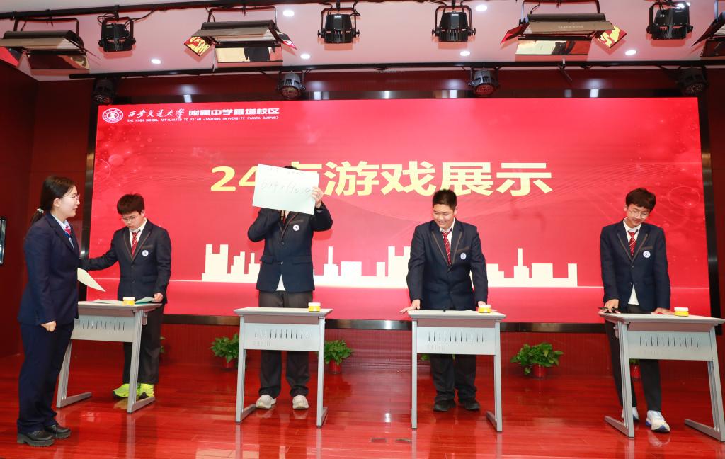趣味数学展示环节亮点纷呈,让大家沉浸式感受数学的乐趣与魔力。初二年级带来24点游戏现场展示,选手们反应敏捷、计算精准,还与台下同学热情互动抢答,灵动的数学思维在现场尽情绽放。